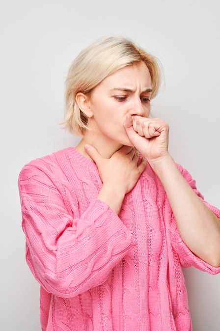• Длительный кашель с мокротой, хрипы, чувство сдавления в груди сигнализируют о поражении бронхиального дерева. Одышка при незначительной нагрузке указывает на нарушение функции дыхания. При появлении боли в грудной клетке нужно исключить пневмонию или обструкцию. Бронхит без температуры у взрослого с кашлем тоже требует диагностики.